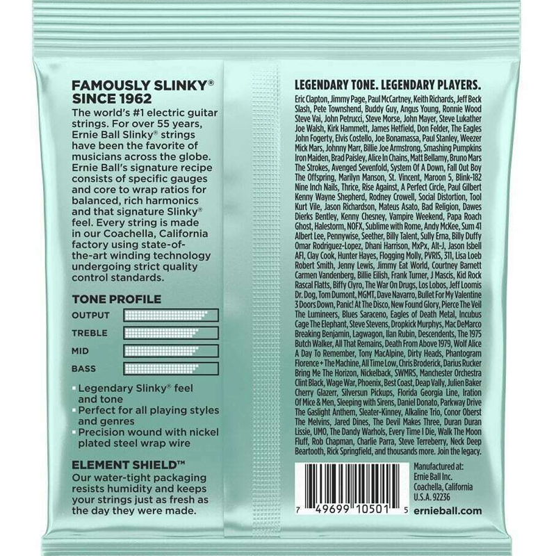 Las Slinky emplean un entorchado de niquel sobre hilo hexagonal para proporcionar el brillo y tensión requerido. Las cuerdas planas utilizan una aleación de carbono de acero para proporcionar un tono perfectamente balanceado.