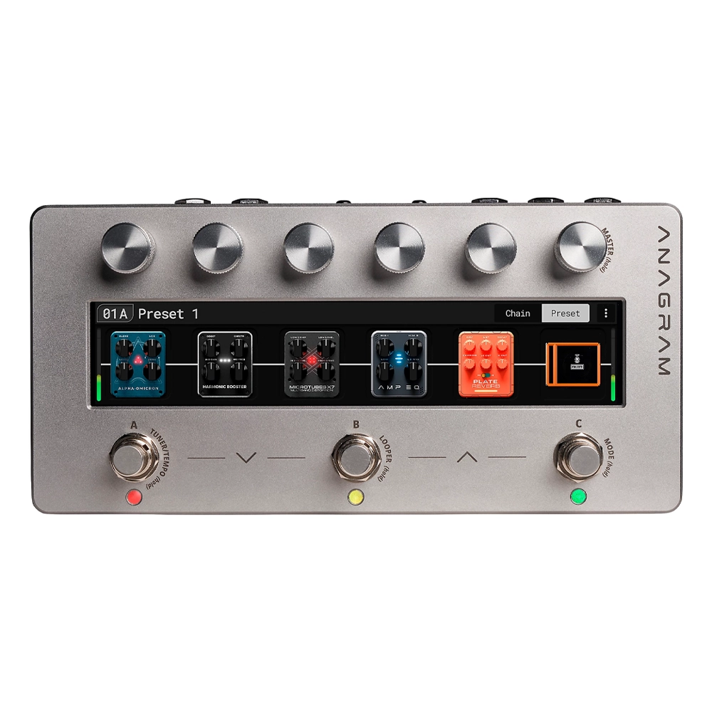 Inspirado en más de 15 años de innovación, el workstation insignia para bajo Anagram de Darkglass pone el futuro del modelado de frecuencias graves al alcance de tu mano. Diseñado desde cero, esta impresionante unidad en formato pedal revoluciona la forma en que los bajistas pueden abordar sus configuraciones, incorporando funciones avanzadas como la integración con NAM (Neural Amp Modeler), compatibilidad con modelos AIDA-X y un potentísimo procesador hexacore para un rendimiento en tiempo real con baja latencia. Una biblioteca de modelos de amplificadores y efectos de Darkglass, junto con una integración fluida con Darkglass Suite, te ofrece sonidos listos para el escenario desde el primer momento, todo fácilmente gestionado mediante el flujo de trabajo de arrastrar y soltar de Anagram, su interfaz basada en bloques y su pantalla táctil a color. Este sistema de control digital se complementa perfectamente con sus controles físicos, que incluyen seis perillas y tres footswitches para acceder a los tres modos del pedal (Preset, Scene y Stomp), looper integrado, cargador de IR, ecualizador global y mezclador.