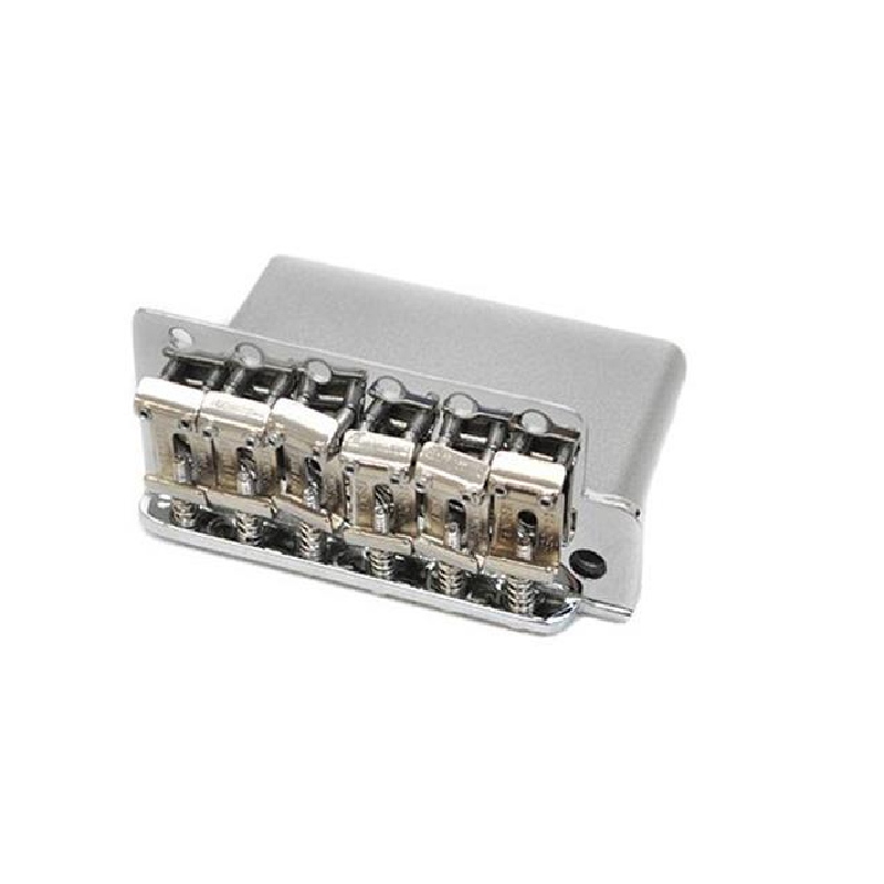 Espaciado de montaje estilo vintage de 2-3 / 16 » Seis monturas de puente estampadas «Fender» con tornillos de montaje Garra tremolo y resortes Brazo tremolo con punta y muelles de tensión incluidos Árbol de cadena, accesorios de montaje y llave de ajuste incluidos Para los modelos de Stratocaster de la serie American Vintage.